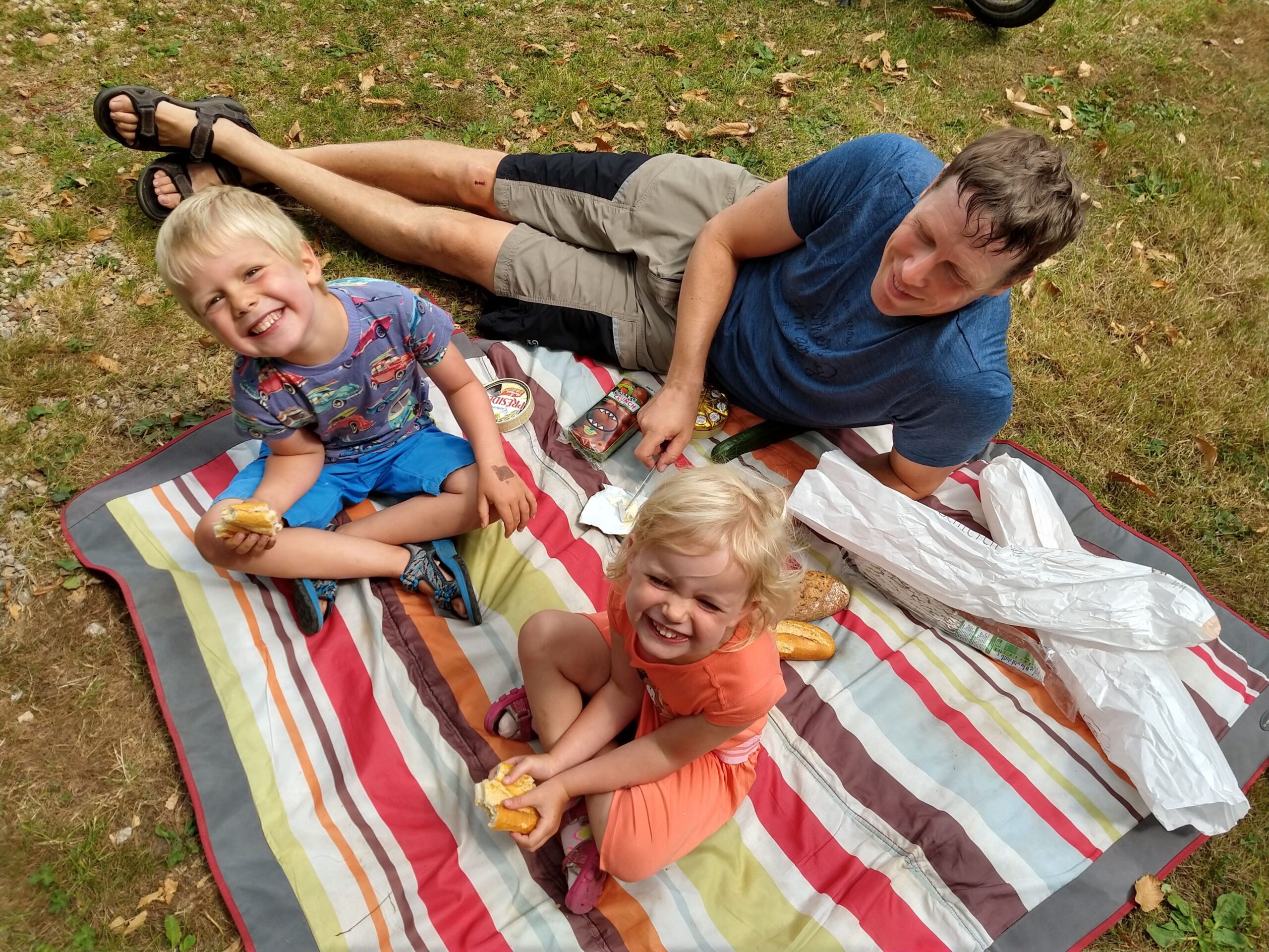 Rond 11u30 kwam een hongertje op. We picknickten aan de kerk van Moortsele (bij Oosterzele). Na een bezoek aan het kerkhof zagen we plots de kikkerpoel waarin mevrouw Helderder gevallen is (O ja, Pluk van de Petteflet is momenteel hot bij ons 🙂 ). Hannes en Hannah waren onmiddellijk rustig…
